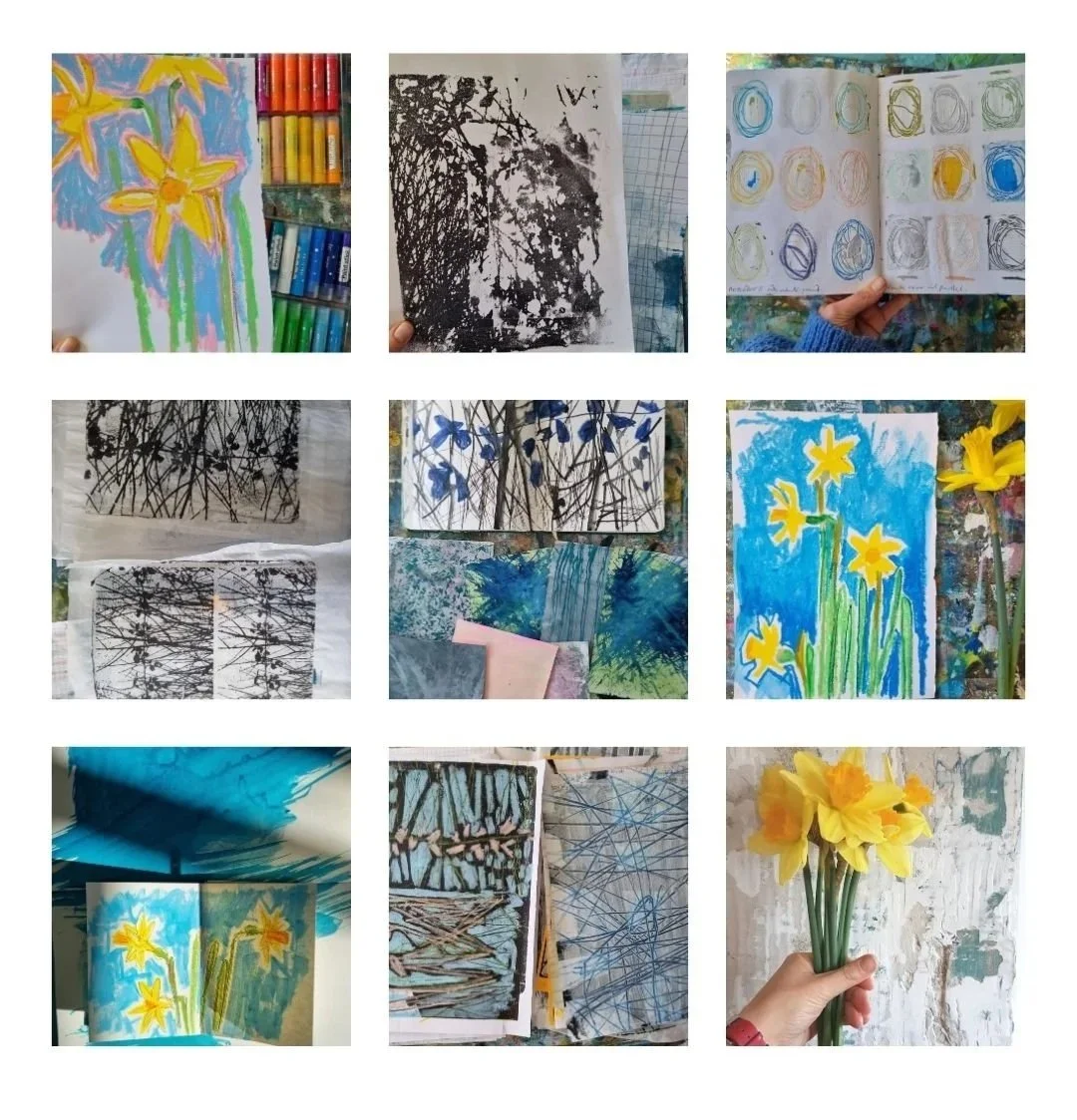 Studio snippets - exploring tempera sticks, gelli plate image transfers, scratching into wet paint, nature made brushes with ink and all the daffodils